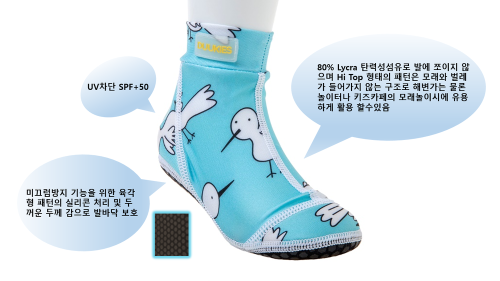 •모래 유입방지 - 목까지 올라오는 형태로 해변가 모래 놀이시 모래가 신발 안으로 들어오는 불편한 점을 보완